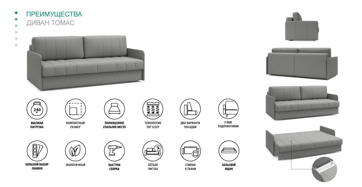 Диван прямой Томас 201 прямой Светло-серый, арт. 10471055 (Спб)
